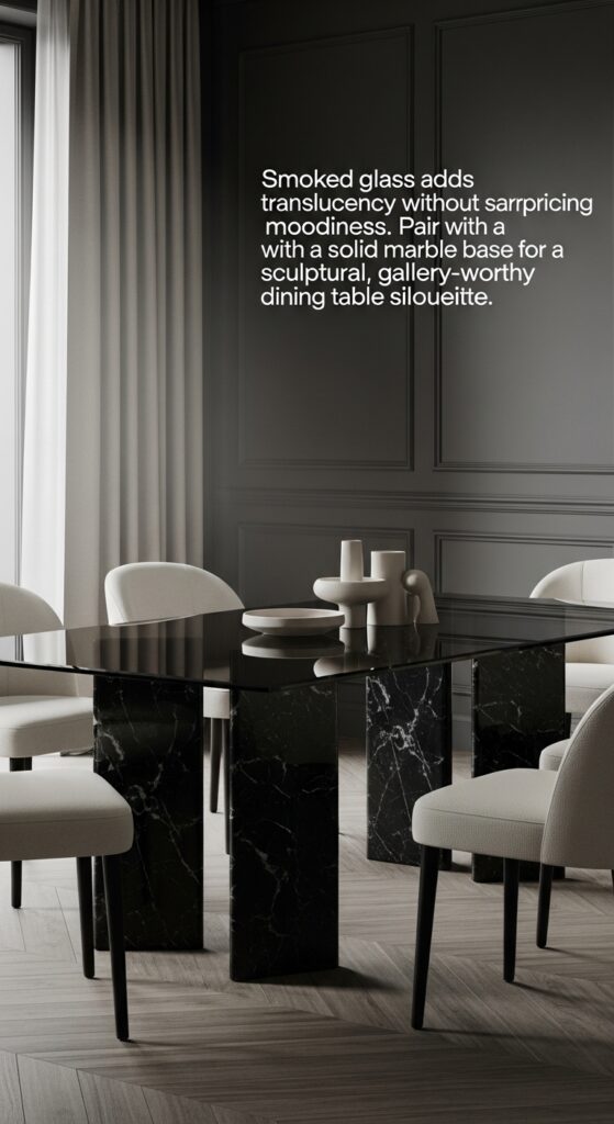 Text: Smoked glass adds translucency without sacrificing moodiness. Pair with a solid marble base for a sculptural, gallery-worthy dining table silhouette.
