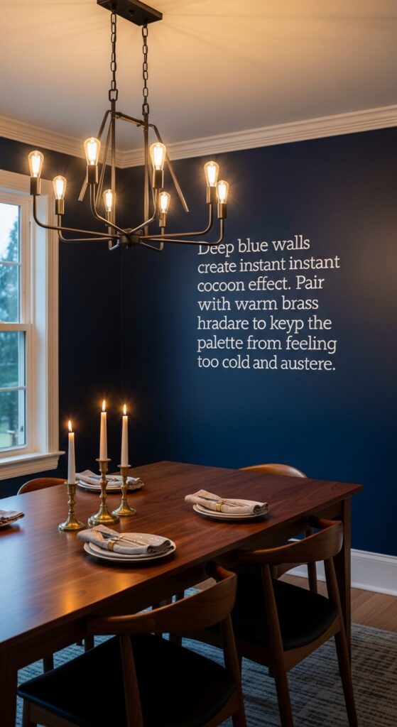 Text: Deep blue walls create an instant cocoon effect. Pair with warm brass hardware to keep the palette from feeling too cold or austere.