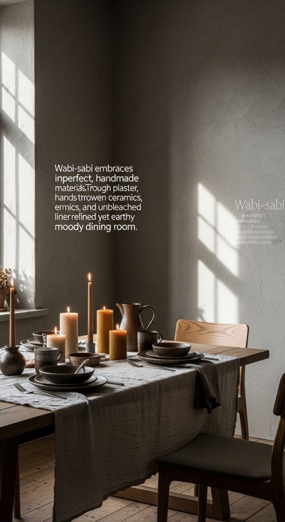Text: Wabi-sabi embraces imperfect, handmade materials. Think rough plaster, hand-thrown ceramics, and unbleached linen for a refined yet earthy moody dining room.