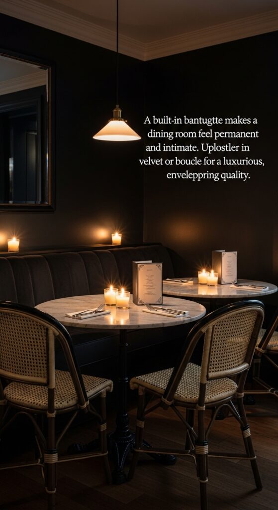 Text: A built-in banquette makes a dining room feel permanent and intimate. Upholster in velvet or boucle for a luxurious, enveloping quality.