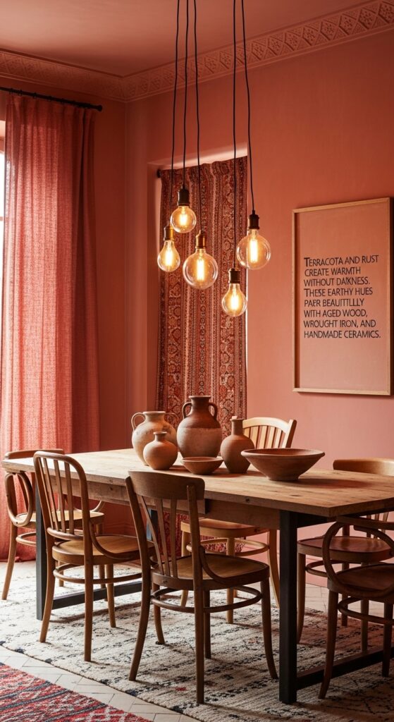 Text: Terracotta and rust create warmth without darkness. These earthy hues pair beautifully with aged wood, wrought iron, and handmade ceramics.
