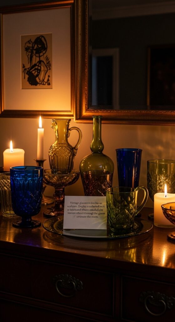 Text: Vintage glassware doubles as sculpture. Display a collected mix on a sideboard where candlelight can refract through the glass and animate the room.