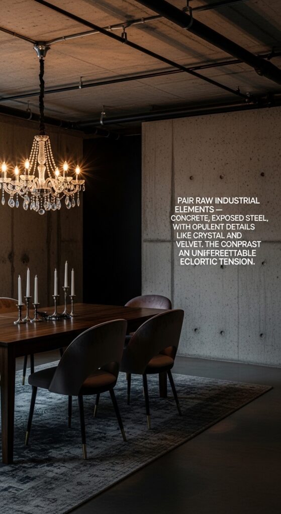 Text: Pair raw industrial elements — concrete, exposed steel — with opulent details like crystal and velvet. The contrast creates an unforgettable eclectic tension.
