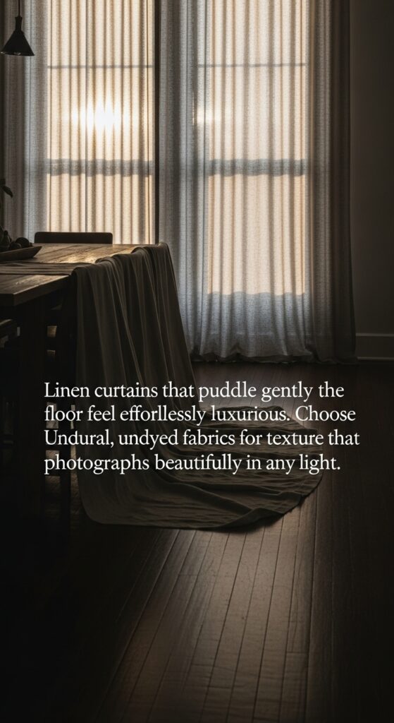 Text: Linen curtains that puddle gently on the floor feel effortlessly luxurious. Choose natural, undyed fabrics for texture that photographs beautifully in any light.