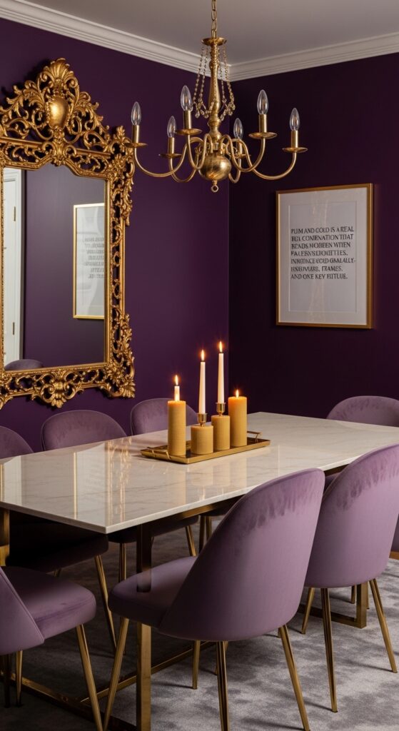 Text: Plum and gold is a regal combination that reads modern when paired with clean silhouettes. Introduce gold gradually — hardware, frames, and one key fixture.