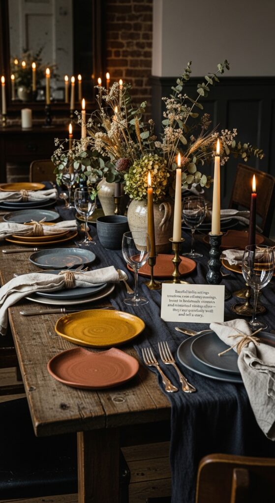 Text: Beautiful table settings transform even ordinary evenings. Invest in handmade ceramics and mismatched vintage silver — they age gracefully and tell a story.