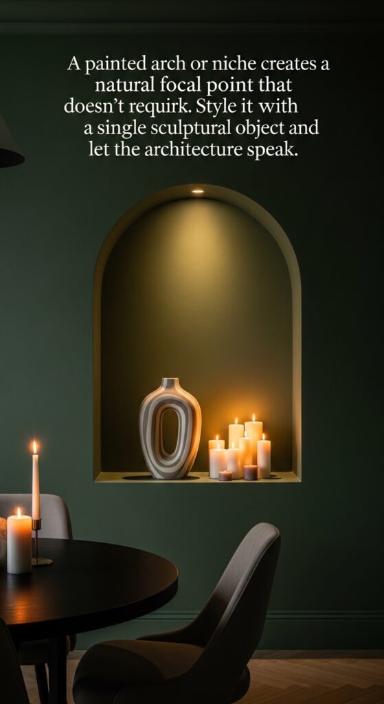 Text: A painted arch or niche creates a natural focal point that doesn’t require artwork. Style it with a single sculptural object and let the architecture speak.