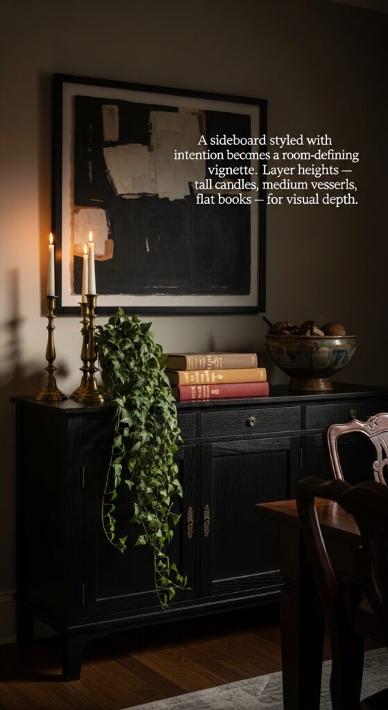 Text: A sideboard styled with intention becomes a room-defining vignette. Layer heights — tall candles, medium vessels, flat books — for visual depth.