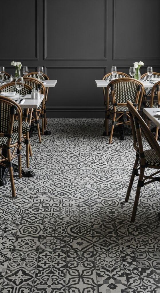 Text: A bold tile floor creates drama from the ground up. Keep walls and furniture quieter to let the pattern breathe without overwhelming the space.