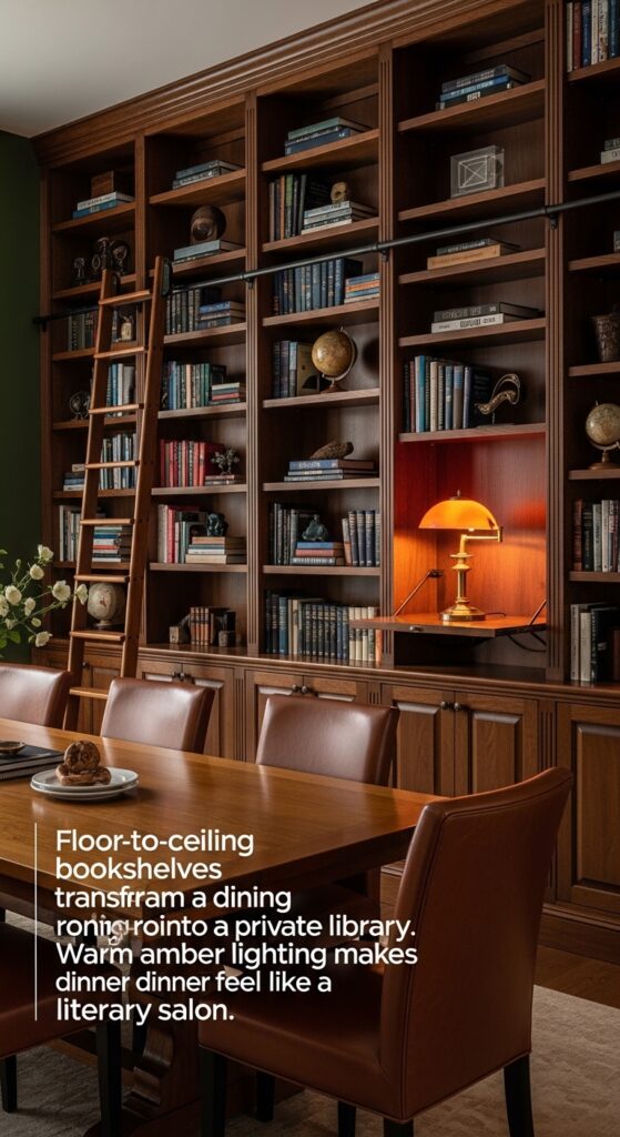 Text: Floor-to-ceiling bookshelves transform a dining room into a private library. Warm amber lighting makes dinner feel like a literary salon.