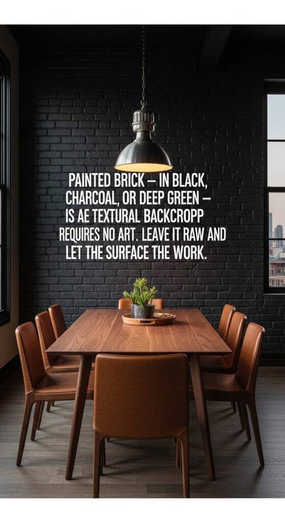 Text: Painted brick — in black, charcoal, or deep green — is a textural backdrop that requires no art. Leave it raw and let the surface do the work.