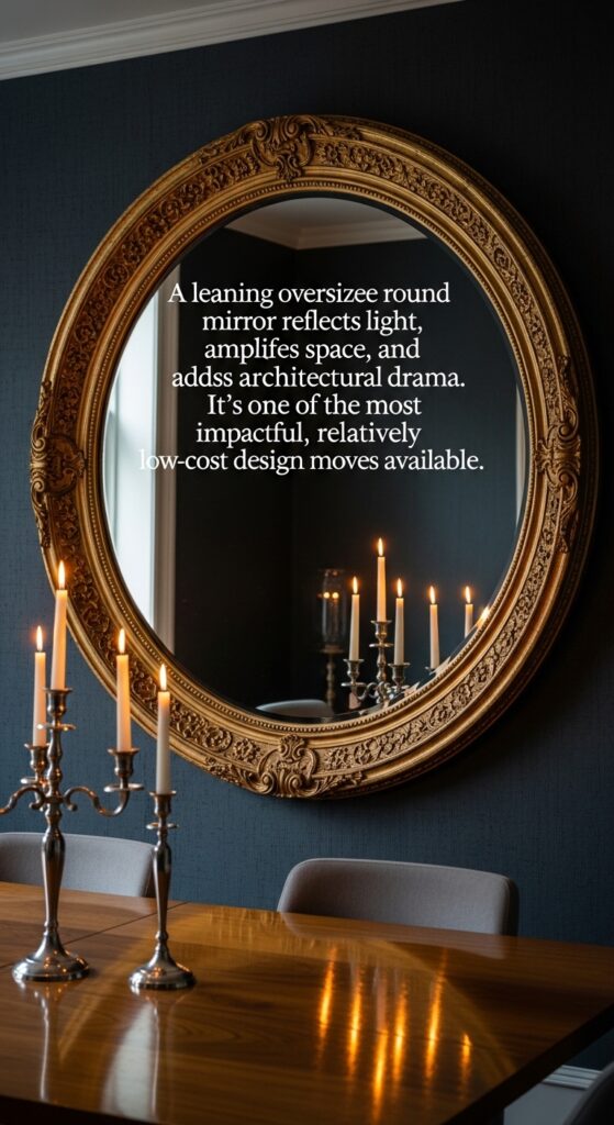 Text: A leaning oversized round mirror reflects light, amplifies space, and adds architectural drama. It’s one of the most impactful, relatively low-cost design moves available.