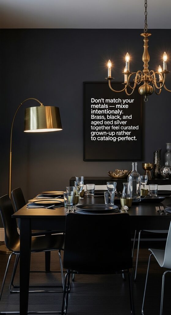 Text: Don’t match your metals — mix them intentionally. Brass, black, and aged silver together feel curated and grown-up rather than catalog-perfect.