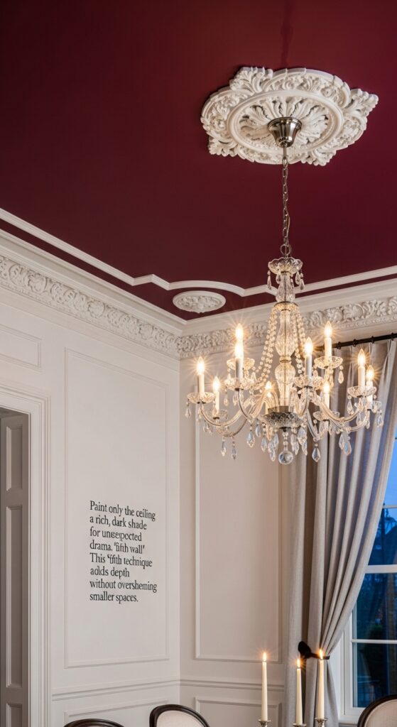 Text: Paint only the ceiling a rich, dark shade for unexpected drama. This “fifth wall” technique adds depth without overwhelming smaller spaces.