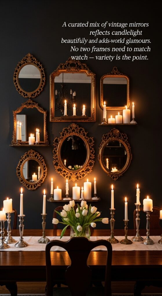 Text: A curated mix of vintage mirrors reflects candlelight beautifully and adds old-world glamour. No two frames need to match — variety is the point.