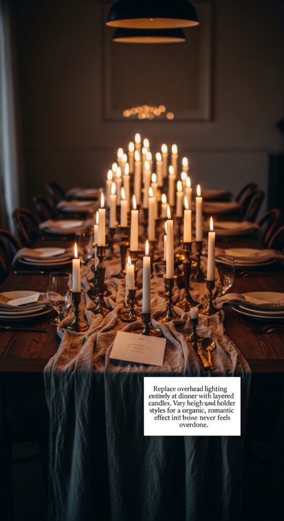 Text: Replace overhead lighting entirely at dinner with layered candles. Vary heights and holder styles for an organic, romantic effect that never feels overdone.