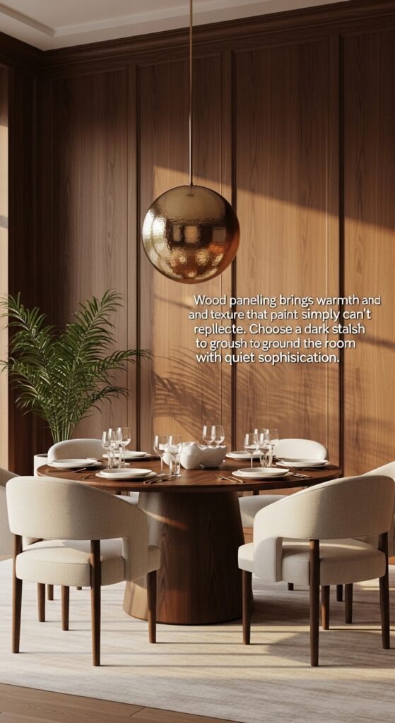 Text: Wood paneling brings warmth and texture that paint simply can’t replicate. Choose a dark stain finish to ground the room with quiet sophistication.