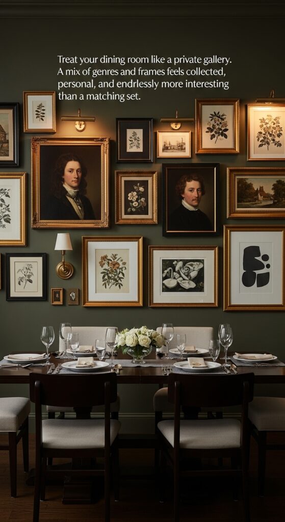 Text: Treat your dining room like a private gallery. A mix of genres and frames feels collected, personal, and endlessly more interesting than a matching set.