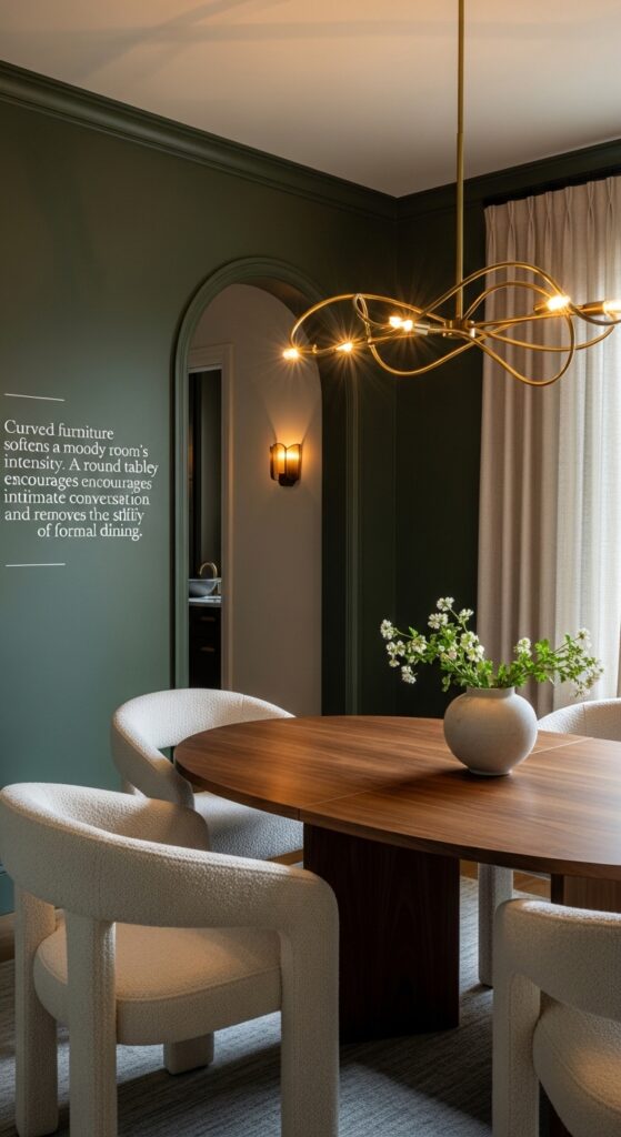 Text: Curved furniture softens a moody room’s intensity. A round table especially encourages intimate conversation and removes the stiffness of formal dining.